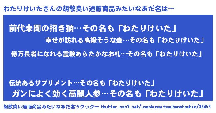 | 男性向けラノベタイトル風あだ名 | 『わたりけいたに滅ぼされるだけの簡単なお仕事です』 |