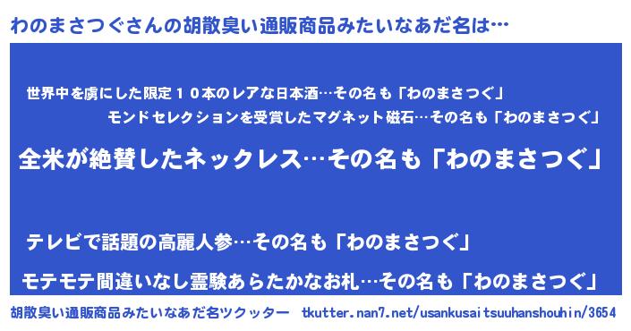 | 男性向けラノベタイトル風あだ名 | 『わのまさつぐの嫁は女の子じゃないと思った?』 |