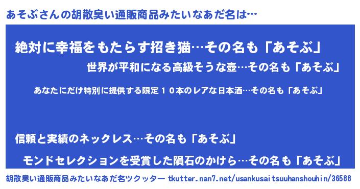| 男性向けラノベタイトル風あだ名 | 『あそぶ~年齢イコール彼女いない歴の魔法使い~』 |