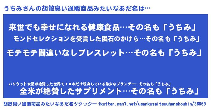 | 男性向けラノベタイトル風あだ名 | 『うちみの憂鬱』『はたらくうちみさま!』 |