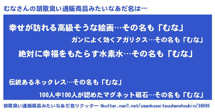 | 男性向けラノベタイトル風あだ名 | 『むなという概念が存在しない退屈な世界 』 |