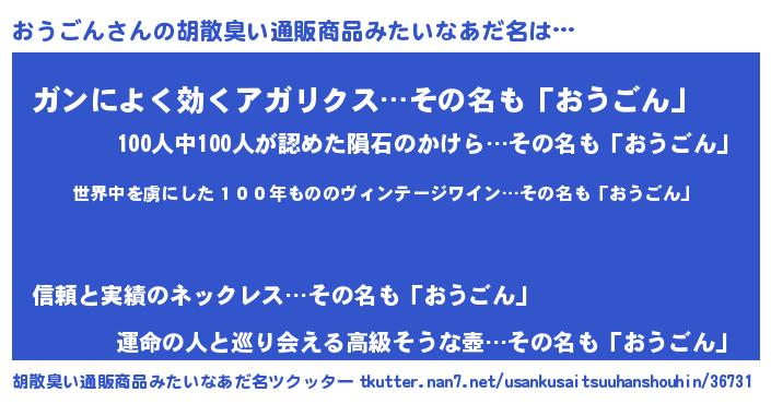 | 男性向けラノベタイトル風あだ名 | 『この素晴らしい世界におうごんを!』 |