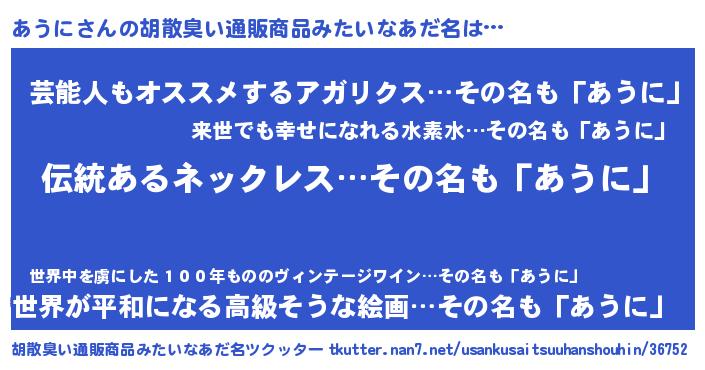 | 意味不明あだ名 | 『とにかく怪しいあうに』『自称あうに』 |