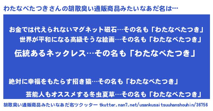 | 意味不明あだ名 | 『とにかく怪しいわたなべたつき』 |