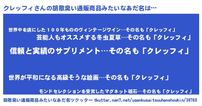 | 男性向けラノベタイトル風あだ名 | 『ダンジョンにクレッフィを求めるのは間違っているだろうか』 |