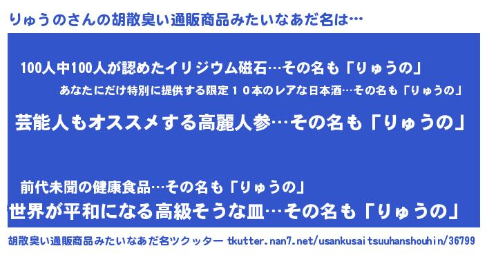 | 男性向けラノベタイトル風あだ名 | 『Re:りゅうのから始める異世界生活』 |