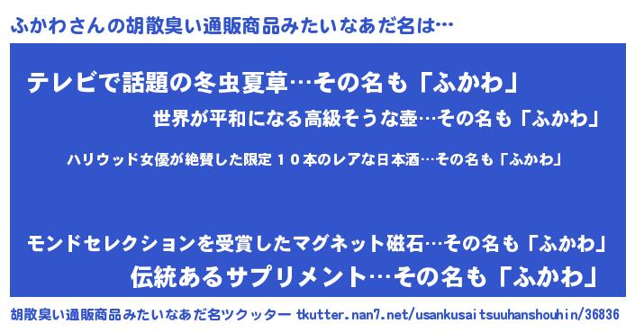 | ヘコむあだ名 | 『ふかっ子』『豆乳』『ふかわ(苦笑)』 |