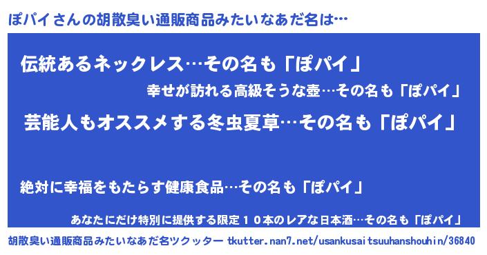 | 男性向けラノベタイトル風あだ名 | 『ぽパイ~年齢イコール彼女いない歴の魔法使い~』 |