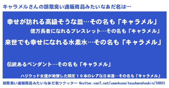 | 男性向けラノベタイトル風あだ名 | 『転生したらキャラメルだった件』 |