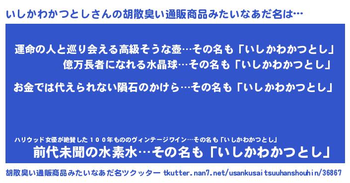 | 男性向けラノベタイトル風あだ名 | 『おまえをオタクにしてやるから、俺をいしかわかつとしにしてくれ! 』 |