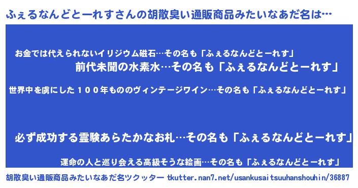 | 男性向けラノベタイトル風あだ名 | 『この素晴らしい世界にふぇるなんどとーれすを!』 |