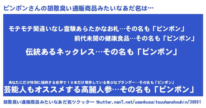 | 男性向けラノベタイトル風あだ名 | 『ピンポンの嫁は女の子じゃないと思った?』 |