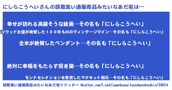 | 男性向けラノベタイトル風あだ名 | 『うちのにしらこうへいが世界を掌握している!』 |