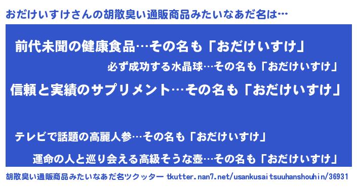 | 男性向けラノベタイトル風あだ名 | 『ダンジョンにおだけいすけを求めるのは間違っているだろうか』 |