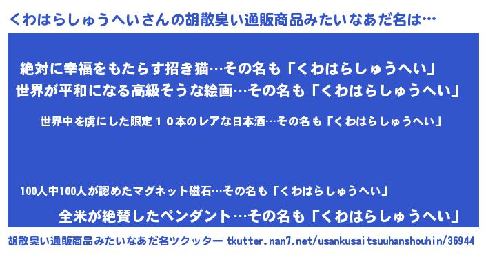 | 意味不明あだ名 | 『住所不定無職くわはらしゅうへい(68歳)』 |