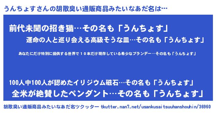 | 意味不明あだ名 | 『住所不定無職うんちょす(79歳)』 |