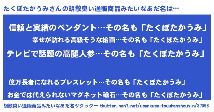 | 意味不明あだ名 | 『自称たくぼたかうみ』 |