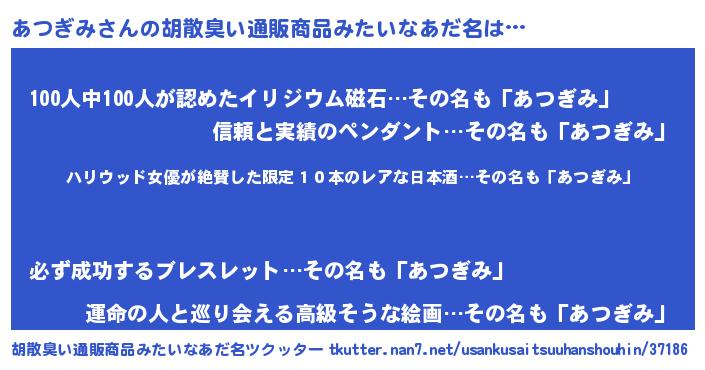 | 意味不明あだ名 | 『住所不定無職あつぎみ(62歳)』 |