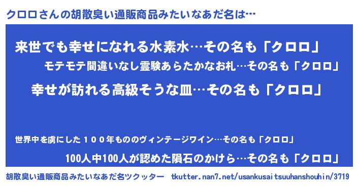| 意味不明あだ名 | 『クロロフォーエバー』『永久保存クロロ』 |