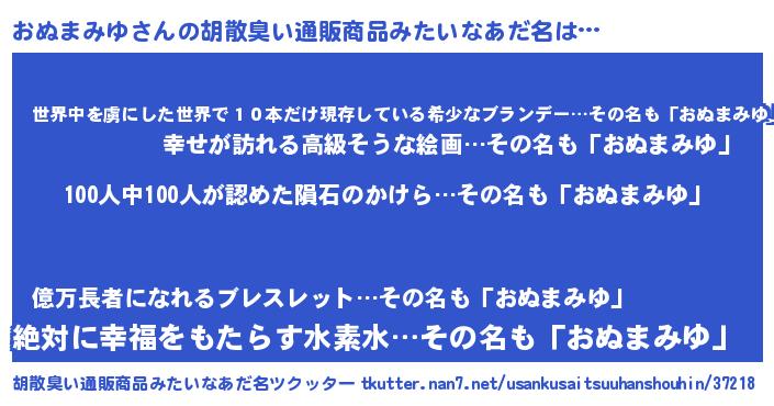| 男性向けラノベタイトル風あだ名 | 『おまえをオタクにしてやるから、俺をおぬまみゆにしてくれ! 』 |