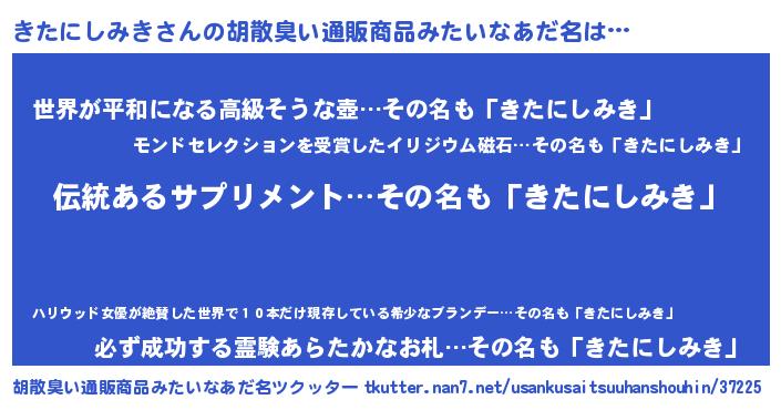 | 男性向けラノベタイトル風あだ名 | 『きたにしみきの嫁は女の子じゃないと思った?』 |