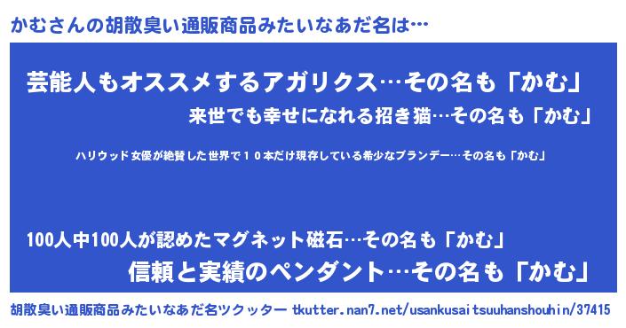 | 意味不明あだ名 | 『住所不定無職かむ(74歳)』『ニラ科かむ属』 |