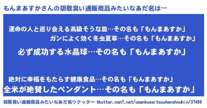 | 男性向けラノベタイトル風あだ名 | 『もんまあすかの憂鬱』 |