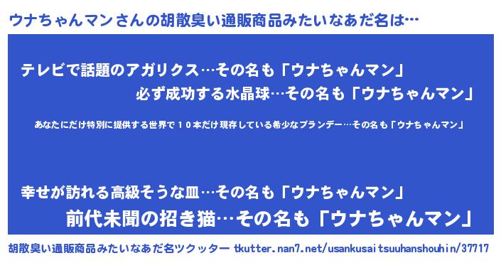 | 男性向けラノベタイトル風あだ名 | 『ウナちゃんマン~年齢イコール彼女いない歴の魔法使い~』 |