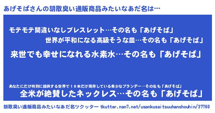 | 男性向けラノベタイトル風あだ名 | 『あげそばという概念が存在しない退屈な世界 』 |