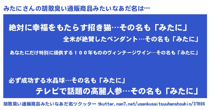 | 意味不明あだ名 | 『住所不定無職みたに(9歳)』『自称みたに』 |