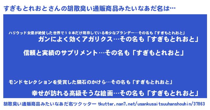 | 欧米人風あだ名 | 『ウサインすぎもとれおと』 |