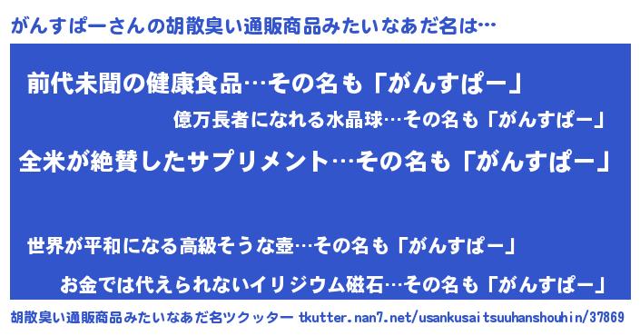 | 男性向けラノベタイトル風あだ名 | 『がんすぱーの嫁は女の子じゃないと思った?』 |
