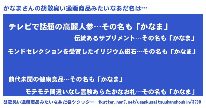 | ヒーロー風カッコイイあだ名 | 『慈愛の使者かなま』『スーパーカナマ』 |
