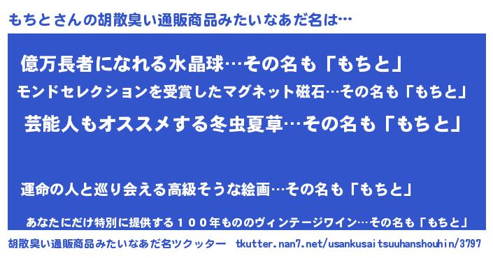 | 意味不明あだ名 | 『自称もちと』『ペロリンもちと』 |