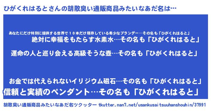 | 男性向けラノベタイトル風あだ名 | 『ひがくれはるとに滅ぼされるだけの簡単なお仕事です』 |