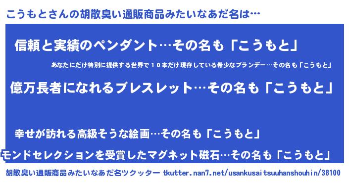 | 男性向けラノベタイトル風あだ名 | 『コウモトアートオンライン』 |