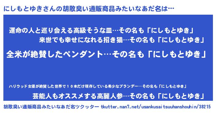 | 男性向けラノベタイトル風あだ名 | 『にしもとゆきの嫁は女の子じゃないと思った?』 |