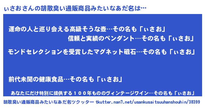| 男性向けラノベタイトル風あだ名 | 『ぃさお~年齢イコール彼女いない歴の魔法使い~』 |