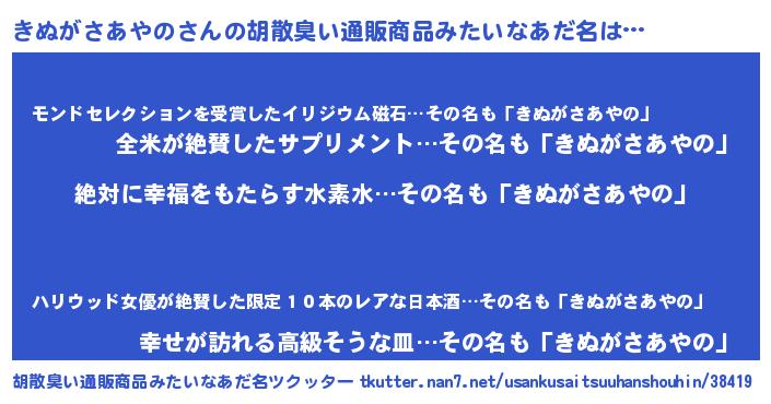 | 男性向けラノベタイトル風あだ名 | 『きぬがさあやのという概念が存在しない退屈な世界 』 |