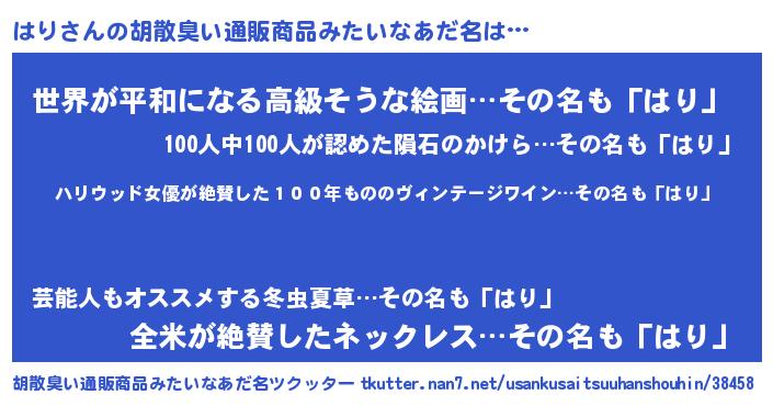 | 意味不明あだ名 | 『住所不定無職はり(2歳)』『自称はり』 |
