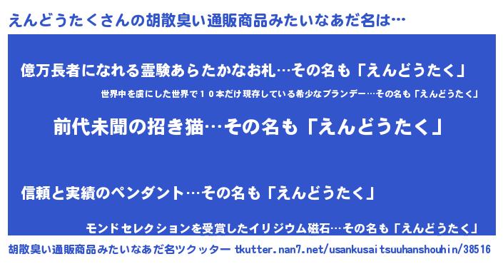 | ヘコむあだ名 | 『えんどうたく(小並感)』『えんもー』 |