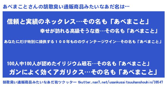 | 男性向けラノベタイトル風あだ名 | 『うちのあべまことが世界を掌握している!』 |