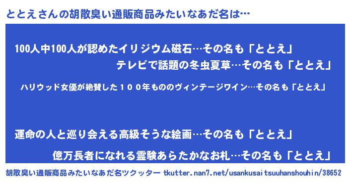 | 意味不明あだ名 | 『住所不定無職ととえ(8歳)』『自称ととえ』 |
