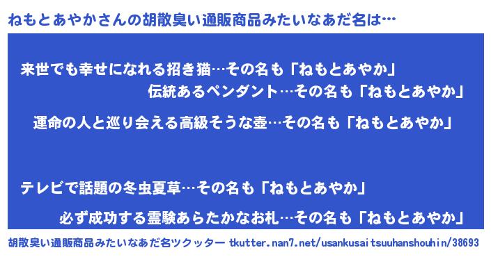 | 男性向けラノベタイトル風あだ名 | 『ねもとあやか~年齢イコール彼女いない歴の魔法使い~』 |