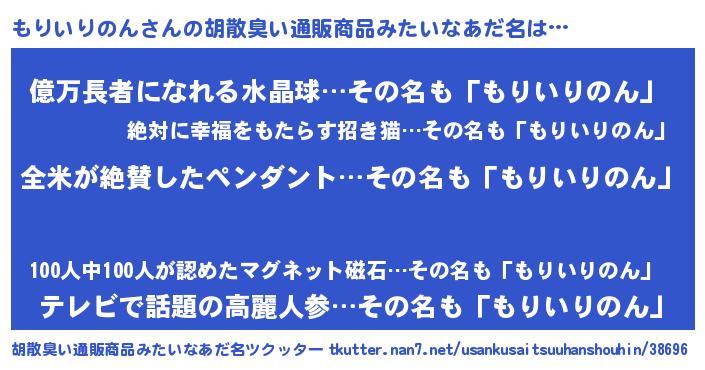 | 男性向けラノベタイトル風あだ名 | 『もりいりのんの嫁は女の子じゃないと思った?』 |