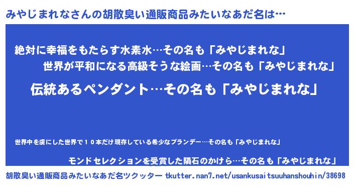 | 男性向けラノベタイトル風あだ名 | 『みやじまれなの嫁は女の子じゃないと思った?』 |