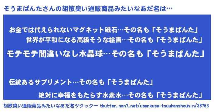 | 男性向けラノベタイトル風あだ名 | 『そうまぱんたの憂鬱』 |