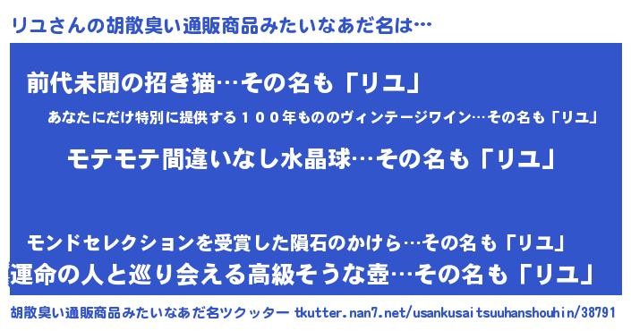 | 意味不明あだ名 | 『ペロリンリユ』『永久保存リユ』 |