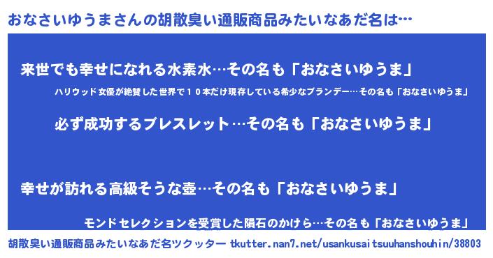 | 男性向けラノベタイトル風あだ名 | 『おなさいゆうまの憂鬱』 |