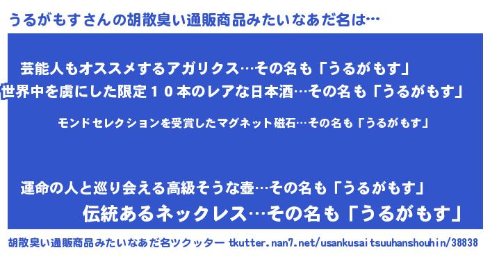 | 男性向けラノベタイトル風あだ名 | 『うちのうるがもすが世界を掌握している!』 |